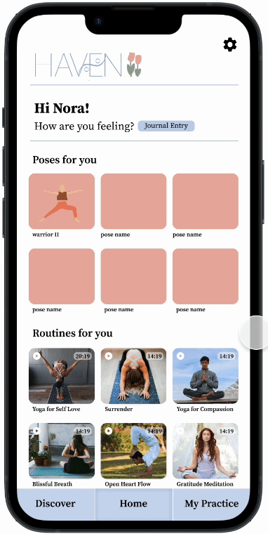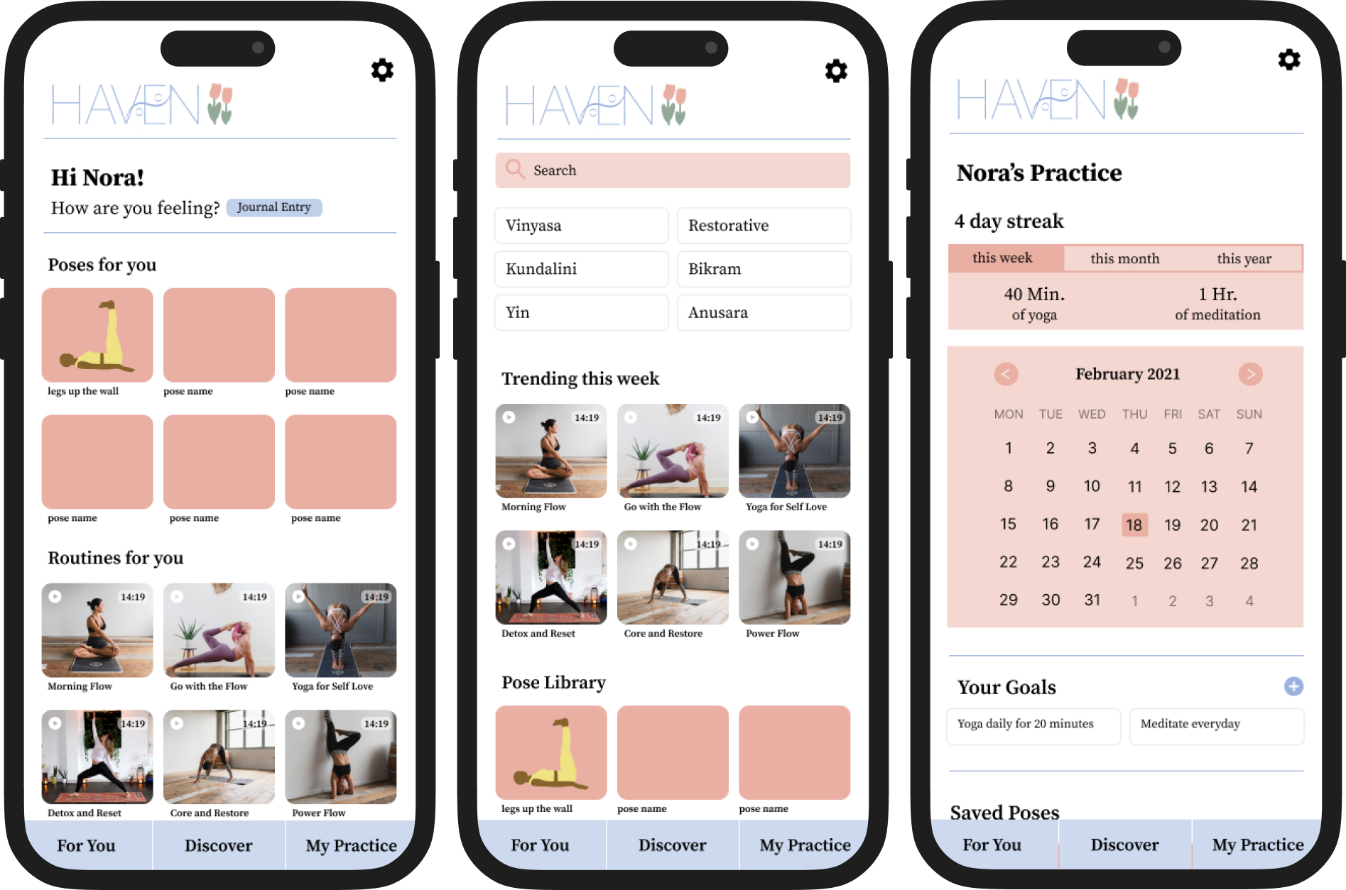 Haven is an app designed to help adults cultivate a spiritual practice that fits their individual needs and lifestyles. It offers movements, routines, rituals, and a daily journal to guide users on their personal journeys, making it easier to pause, reflect, and reconnect with themselves. The ultimate goal was to give users a space to let go of everyday stress while supporting their holistic goals in a way that feels natural and personalized.
