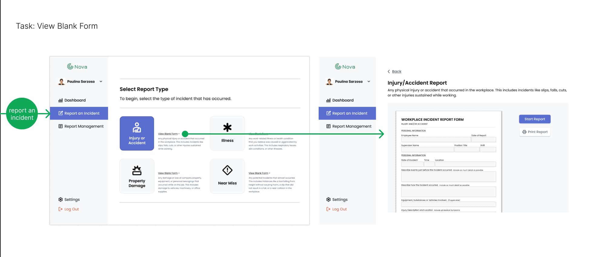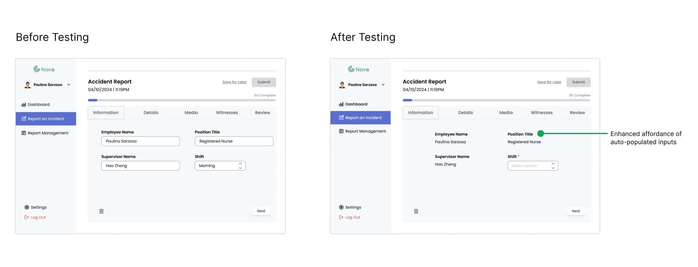 Nova is a web-based portal designed to make error reporting easier for nursing home staff. It’s built as a system that actually works for them: users can quickly log incidents, access previous cases, and see relevant data trends on their dashboard, all without feeling lost in clunky software. The primary goal was to give staff confidence and ease, while simultaneously addressing the much bigger problem of underreporting.