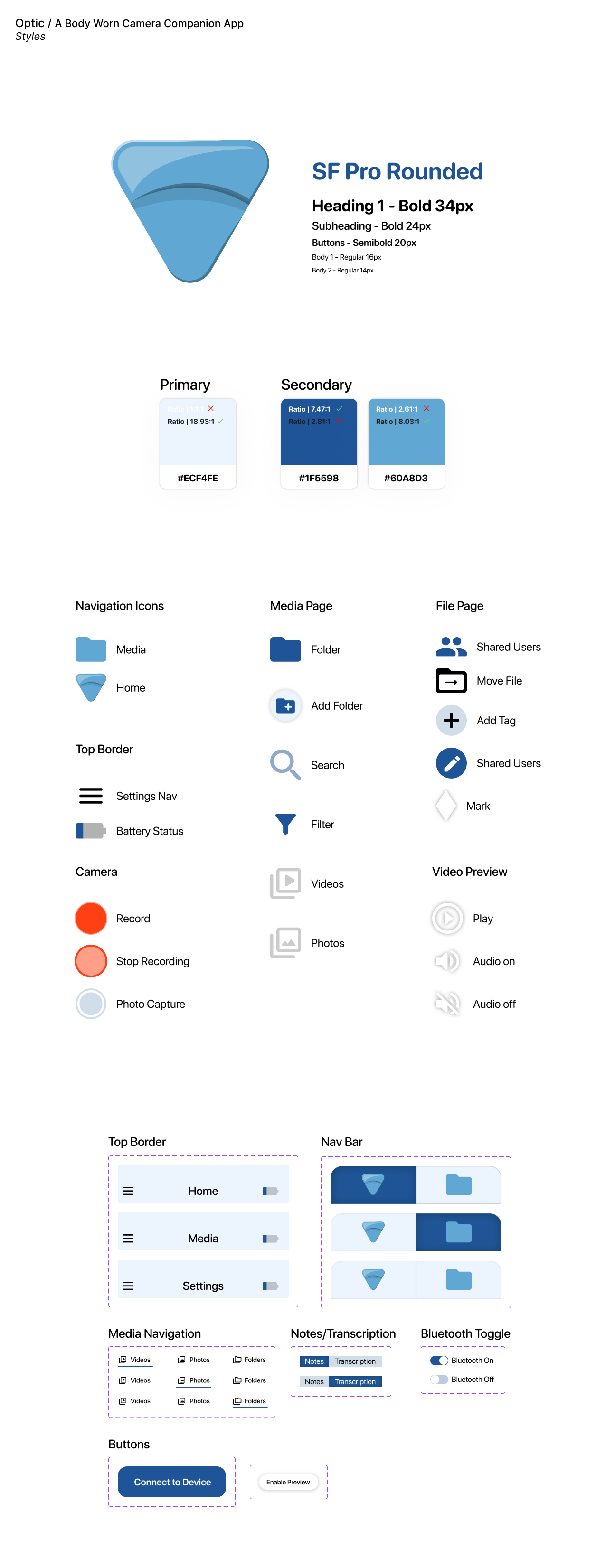 Optic is a mobile companion app built for first responders who rely on Body Worn Cameras (BWCs) in their daily work. It pairs directly with the user’s camera to create a seamless bridge between the physical device and a clean, intuitive mobile interface. The goal was simple: empower users with an easy, low-friction way to store, organize, and quickly retrieve essential media, all while they focus on capturing real-time data on the job.